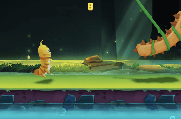 This is a charming side-scrolling runner game where players control a cute yellow striped caterpillar running through a magical forest. The art style is cartoonish and vibrant, with a dark woodland backdrop illuminated by glowing fireflies and soft light beams, creating a dreamy and mysterious atmosphere. The caterpillar has expressive eyes and smooth animations, holding a small bouquet of flowers, adding to its playful charm. Players tap and hold the screen to speed up, releasing to slow down—timing and rhythm are key to avoid obstacles or pitfalls. The gameplay is simple yet engaging, focusing on pace control and reflexes. As the run progresses, speed increases, raising the challenge. With its whimsical visuals and gentle soundtrack, the game offers a relaxing yet addictive experience. Perfect for casual play, it appeals especially to fans of cute characters and nature-themed adventures.